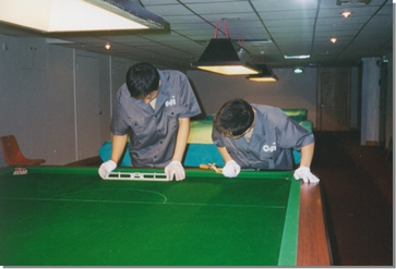 派往日本的臺球桌安裝工人以精湛的技術(shù)為客戶服務(wù)。